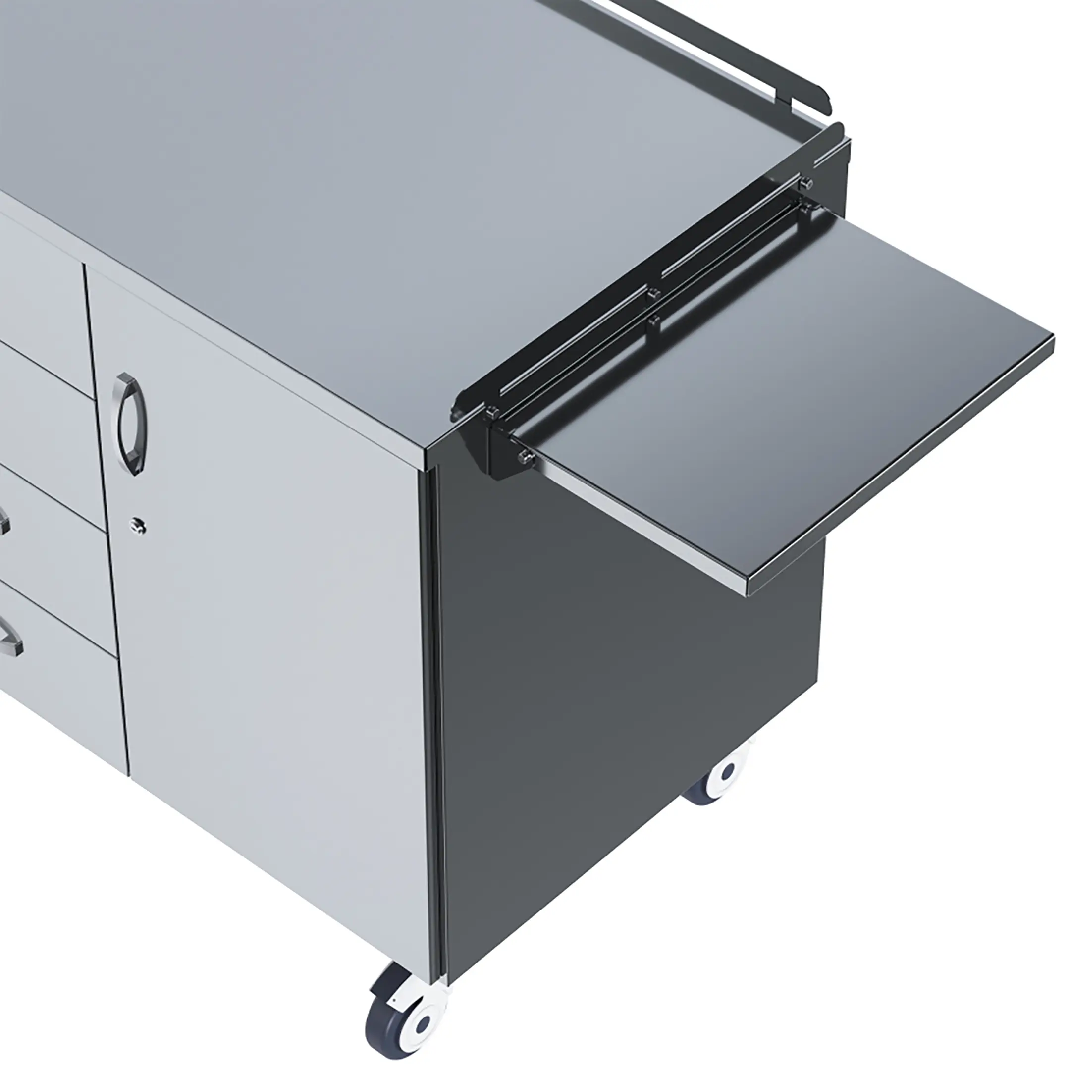 • колеса поворотные, самоориентирующиеся, диаметром 100 мм, комплектуются надёжной стальной вилкой с прецизионным радиально-упорным подшипником, ободом из полипропилена и шинкой из серого полиуретана, не оставляющего следов на полу, два колеса – с индивидуальным тормозным устройством;
