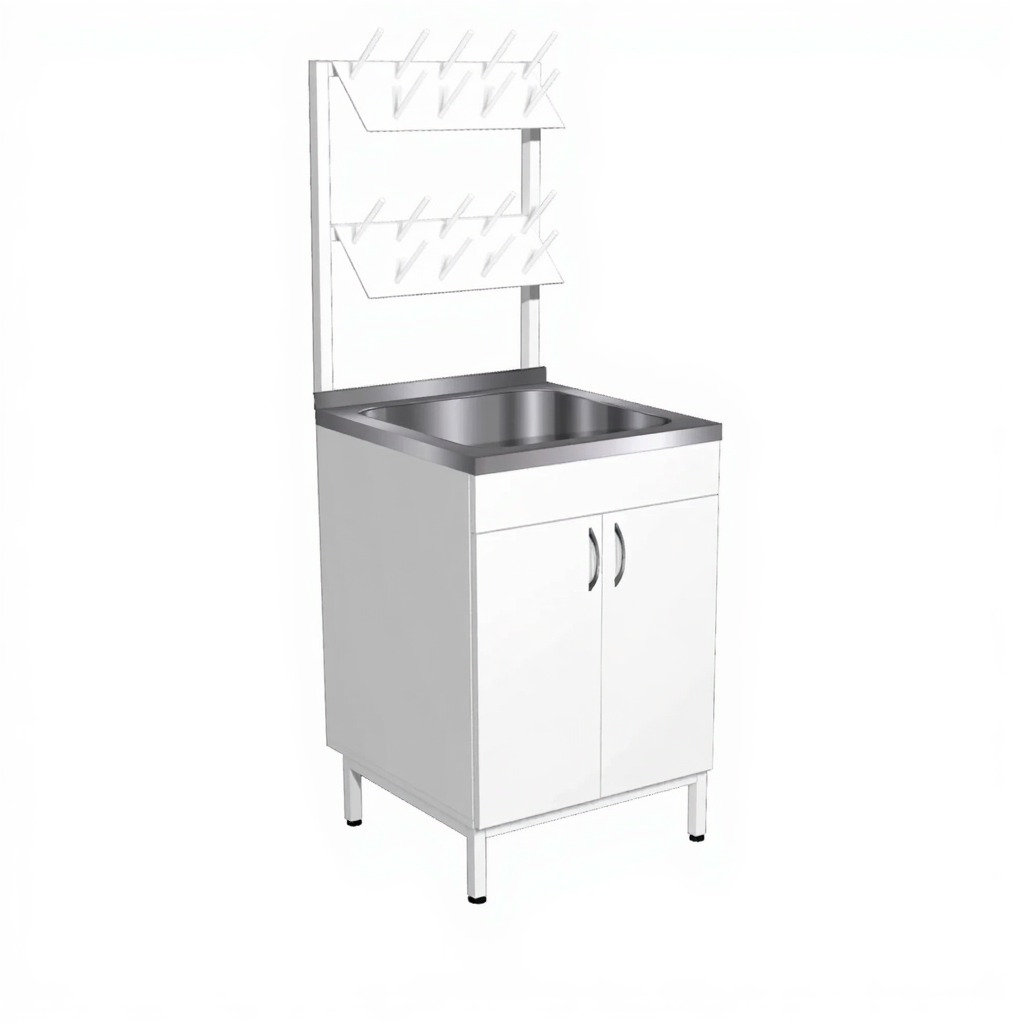 Стол-мойка с сушкой СТм-101/1 (ЛДСП белый, каркас белый) предназначен для оборудования рабочего места в медицинских, процедурных кабинетах и лабораторий. Материалы, используемые при изготовлении модуля с мойкой усточивы к дезинфицирующим средствам.