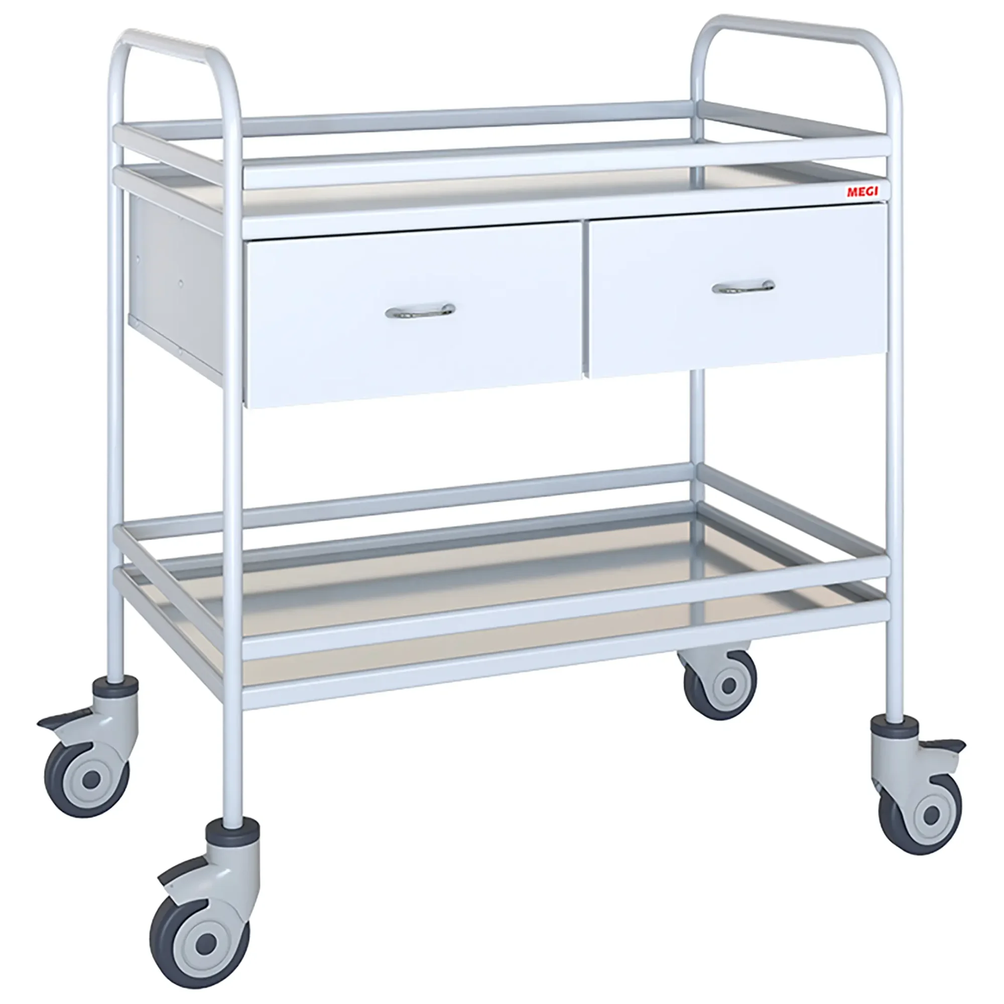 Столик комплектуется двумя поддонами из нержавеющей стали и выдвижными ящиками.
