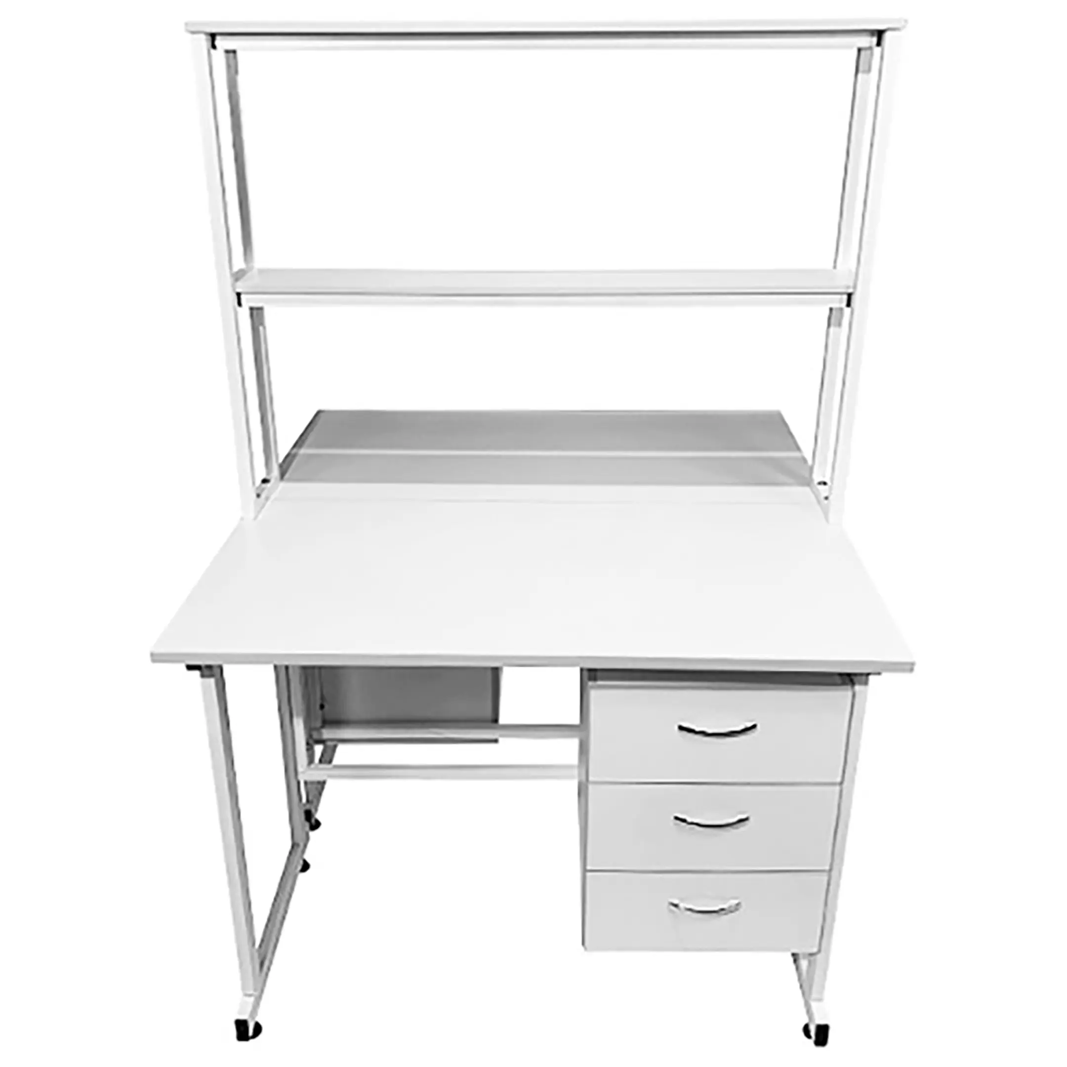Стол лабораторный островной с надстройкой Сло 22.015 (белый) идеально подходит для создания двух функциональных рабочих мест в лабораториях и медицинских учреждениях. Модель оснащена двумя рабочими местами, каждое с подвесной тумбой с тремя выдвижными ящиками, и центральной надстройкой с двумя полками. Каркас выполнен из стального профиля, столешницы из ЛДСП толщиной 22 мм.