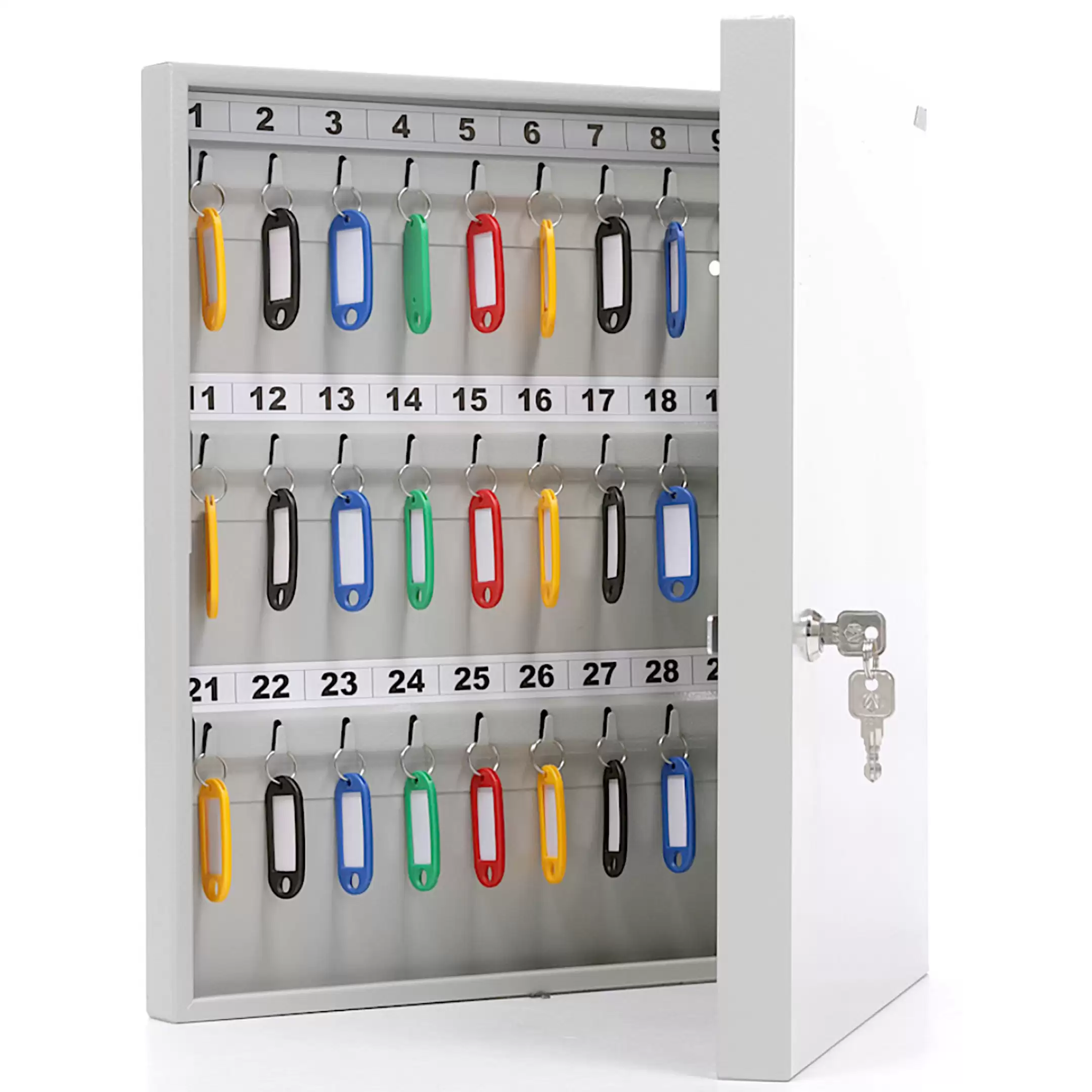 - Эффективная организация и быстрый поиск — шестьдесят пронумерованных ячеек и комплект брелков создают четкую и прозрачную систему. Это позволяет мгновенно находить нужный ключ, вести точный журнал учета и легко контролировать их выдачу и возврат ответственными лицами, повышая операционную эффективность.