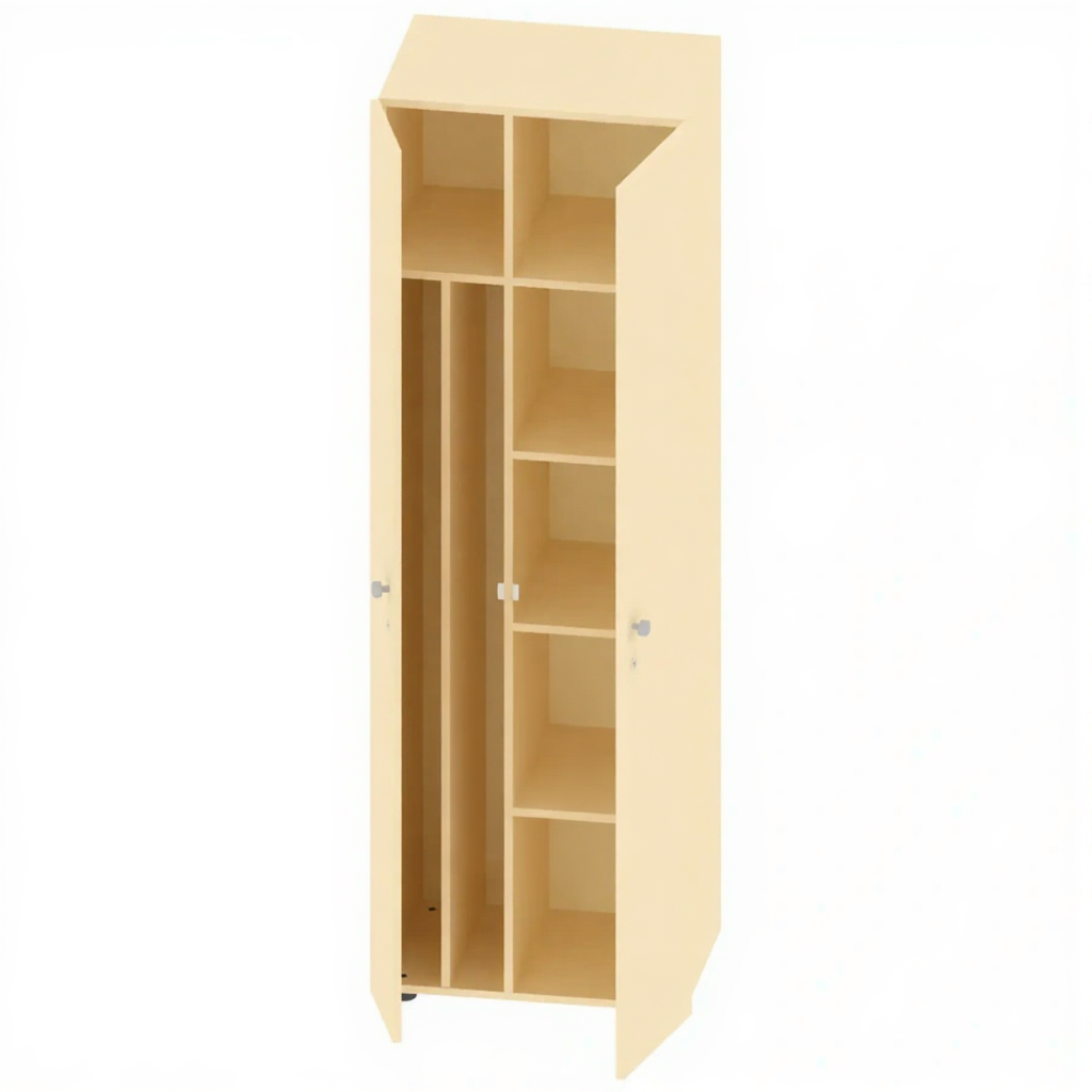 - Компактность и оптимальное использование пространства — шкаф имеет небольшие габариты, что позволяет удобно разместить его в подсобных комнатах, санузлах, под лестницами или в углах помещений, обеспечивая при этом достаточный объем для хранения всего необходимого инвентаря.