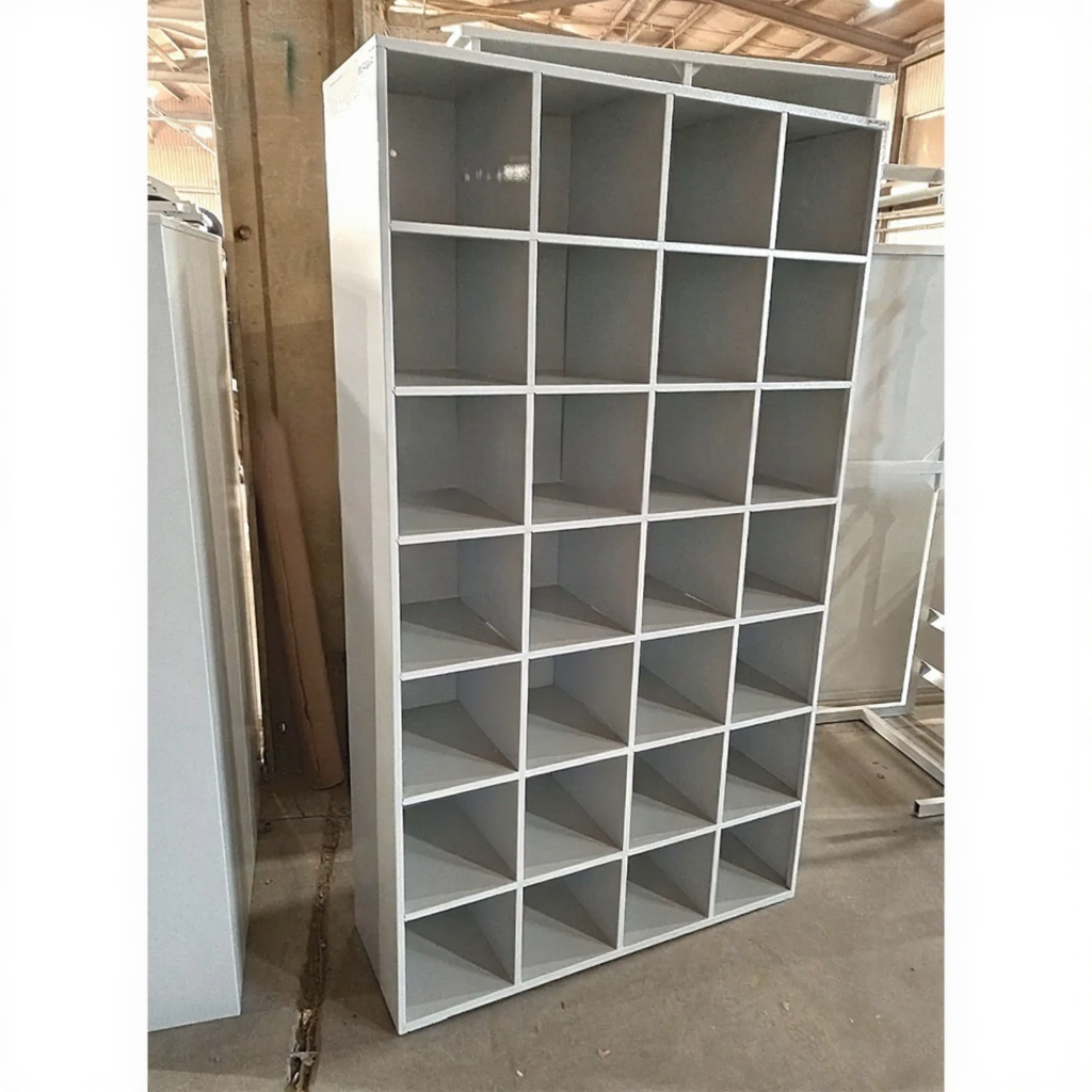 - Удобная и практичная конструкция — шкаф спроектирован для легкого доступа: ячейки часто имеют наклонную полку или бортик, чтобы обувь не выпадала, и обеспечивают базовую вентиляцию.