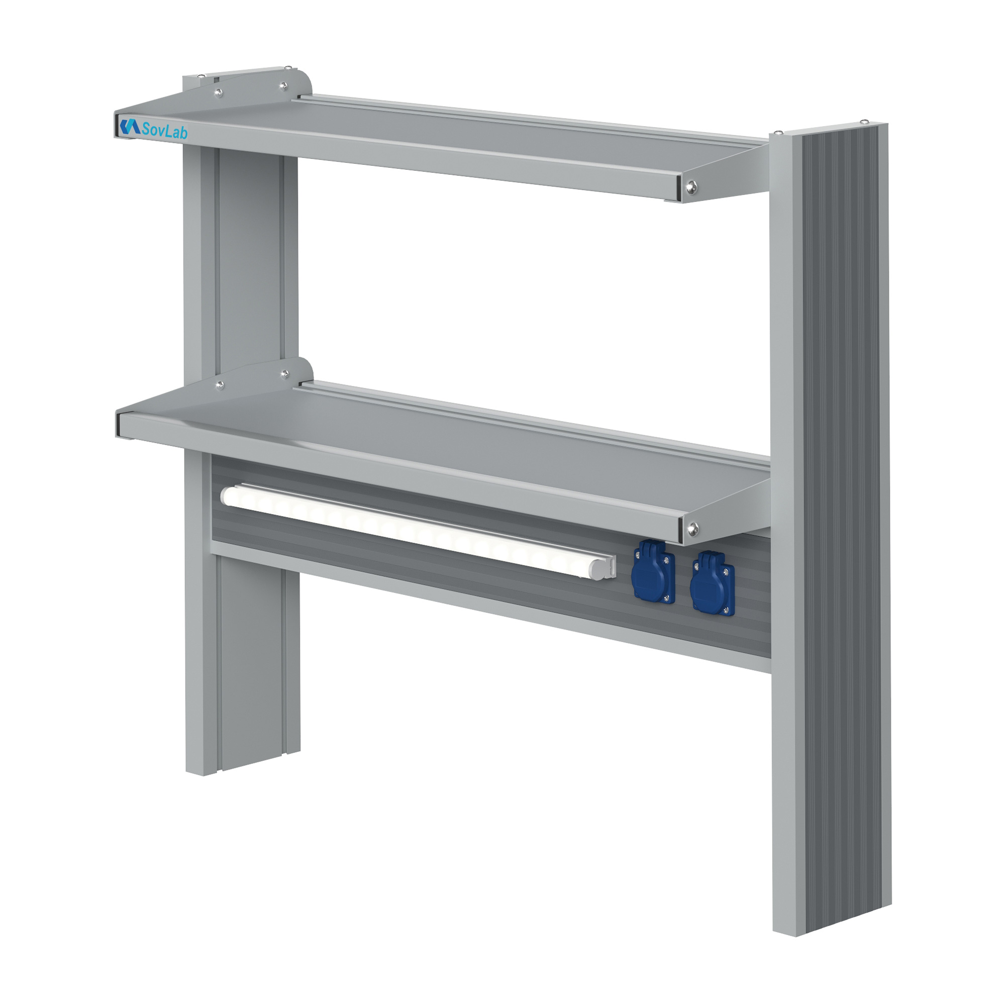 - Компактная и вместительная конструкция — две полки глубиной 300 мм в алюминиевых рамках позволяют разместить лабораторный инвентарь и оборудование.