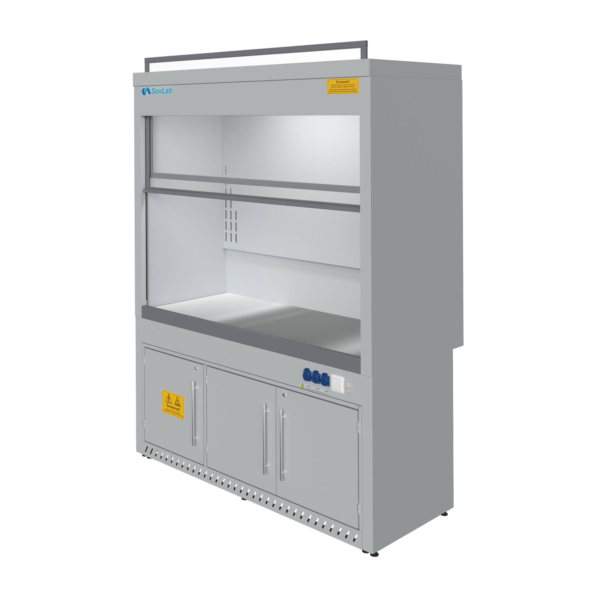 - Безопасная работа с летучими веществами — вертикально-подъемный защитный экран из ударопрочного стекла с системой плавного хода и фиксации.