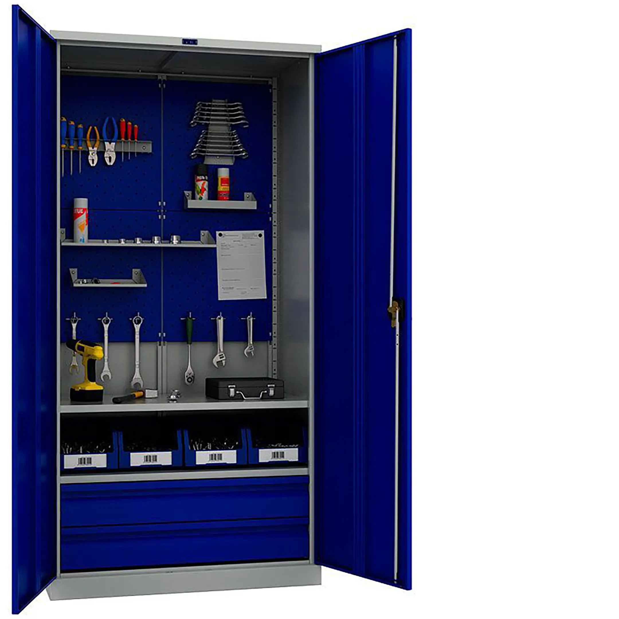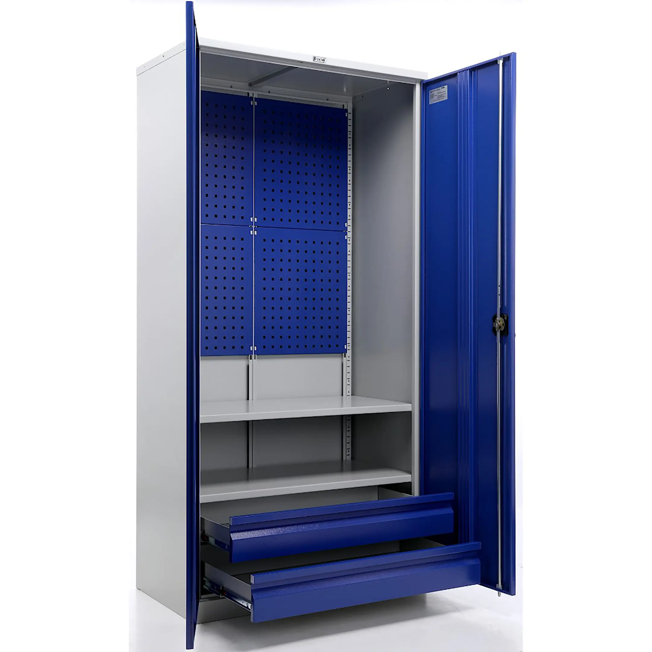 - Максимальная организация и наглядность — модель оборудована обширными перфорированными панелями (система «перфо») на дверцах и, как правило, на задней стенке. Это позволяет удобно, компактно и наглядно разместить огромное количество инструмента на крючках и держателях, обеспечивая мгновенный визуальный контроль его наличия и комплектности.