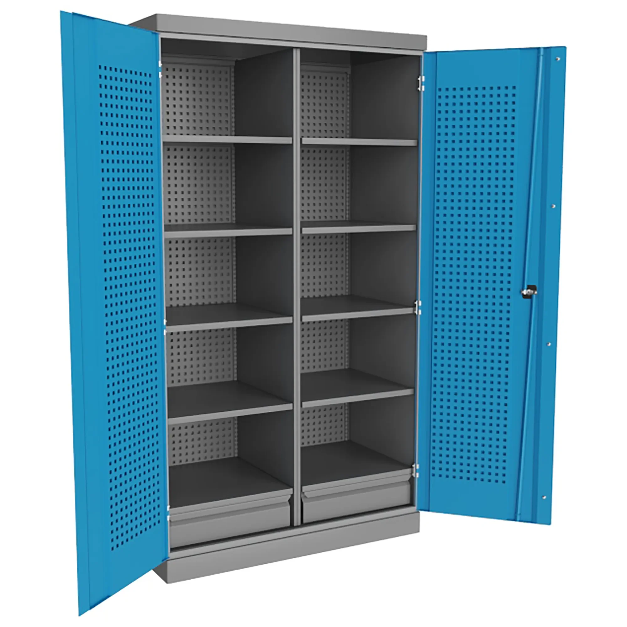 - Специализированная система хранения для инструмента ЧПУ — шкаф оснащен специальными держателями, перфорированными панелями с точными позициями или регулируемыми блоками, предназначенными для безопасного и компактного размещения фрез, сверл, резцов, цанг, оправок и другой прецизионной оснастки. Каждый инструмент фиксируется в индивидуальной ячейке, исключая контакт режущих кромок и предотвращая их повреждение.