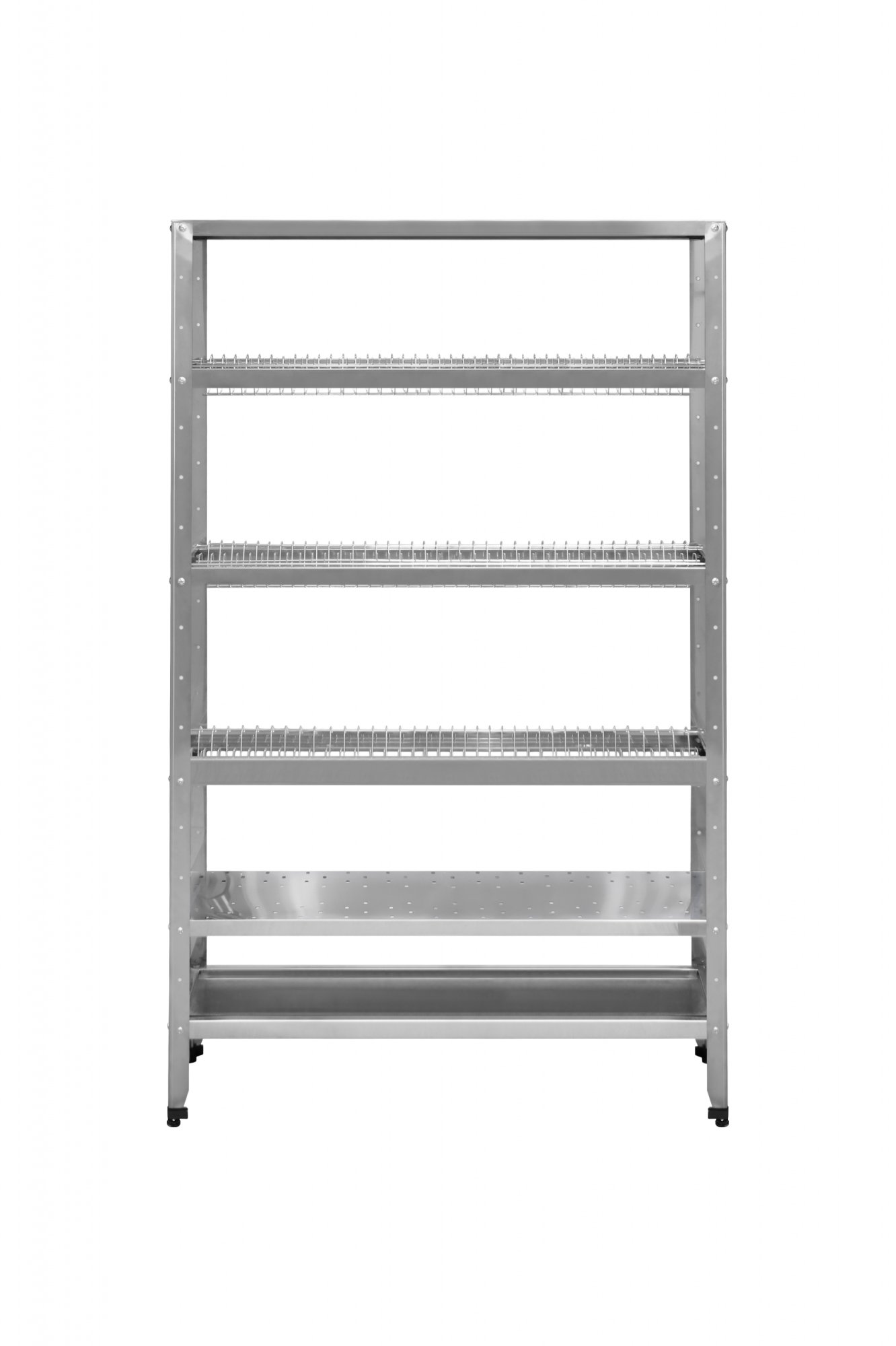 5 полок (сверху-вниз: верхняя сплошная, 3 полки для посуды, перф.полка для сушки стаканов) + поддон-полка с углублением для сбора стекающей воды.