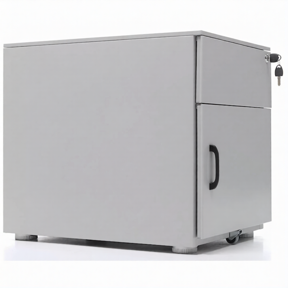 Опции: пластиковые лотки и металлический ящик для канцелярских принадлежностей и других предметов. Возможность комбинирования цветов: корпус + фасады ящиков и крышка (конструкция тумбы металл+металл). Или отделка фасадов ящиков и крыши тумбы ламинированной плитой ЛДСП (конструкция тумбы металл+ЛДСП)