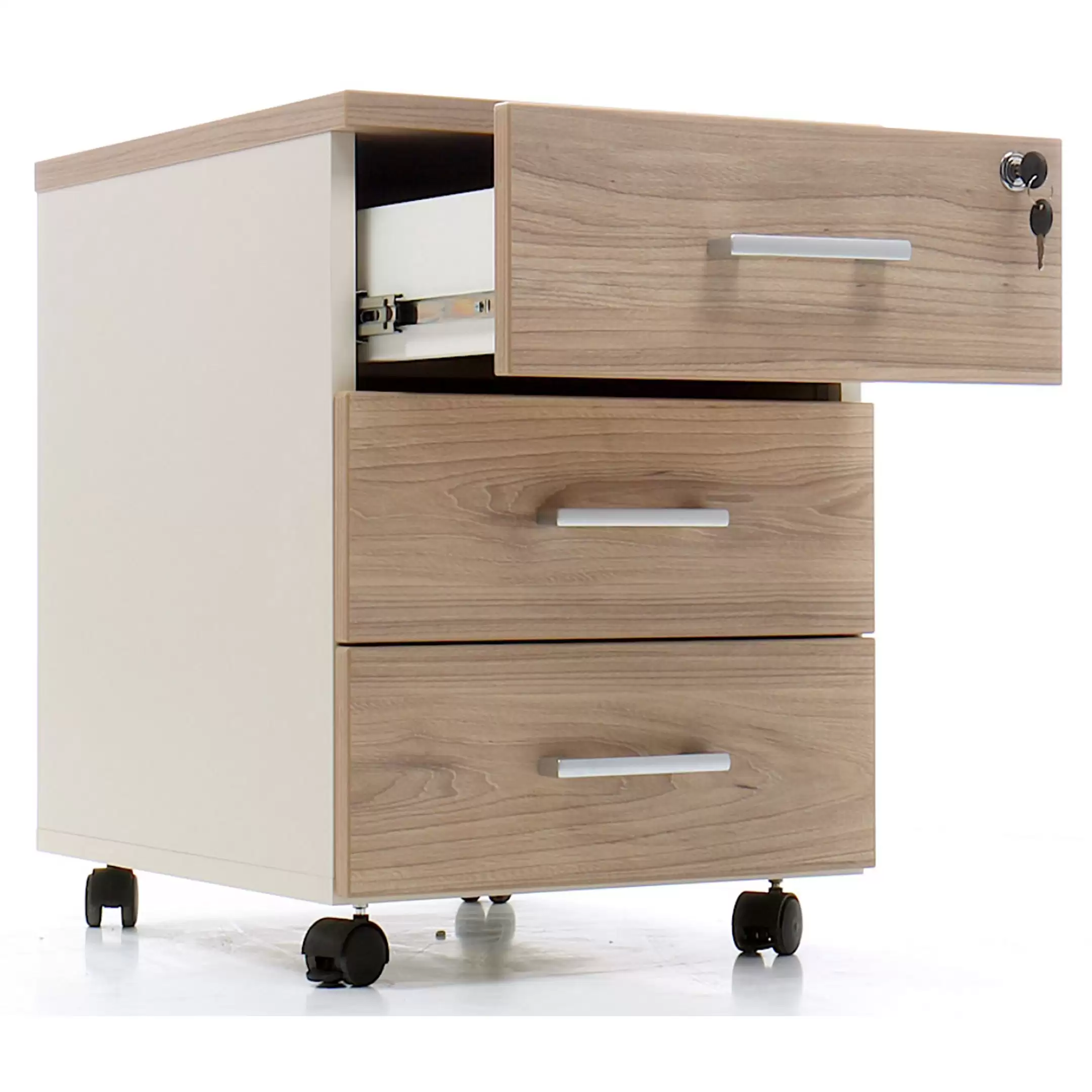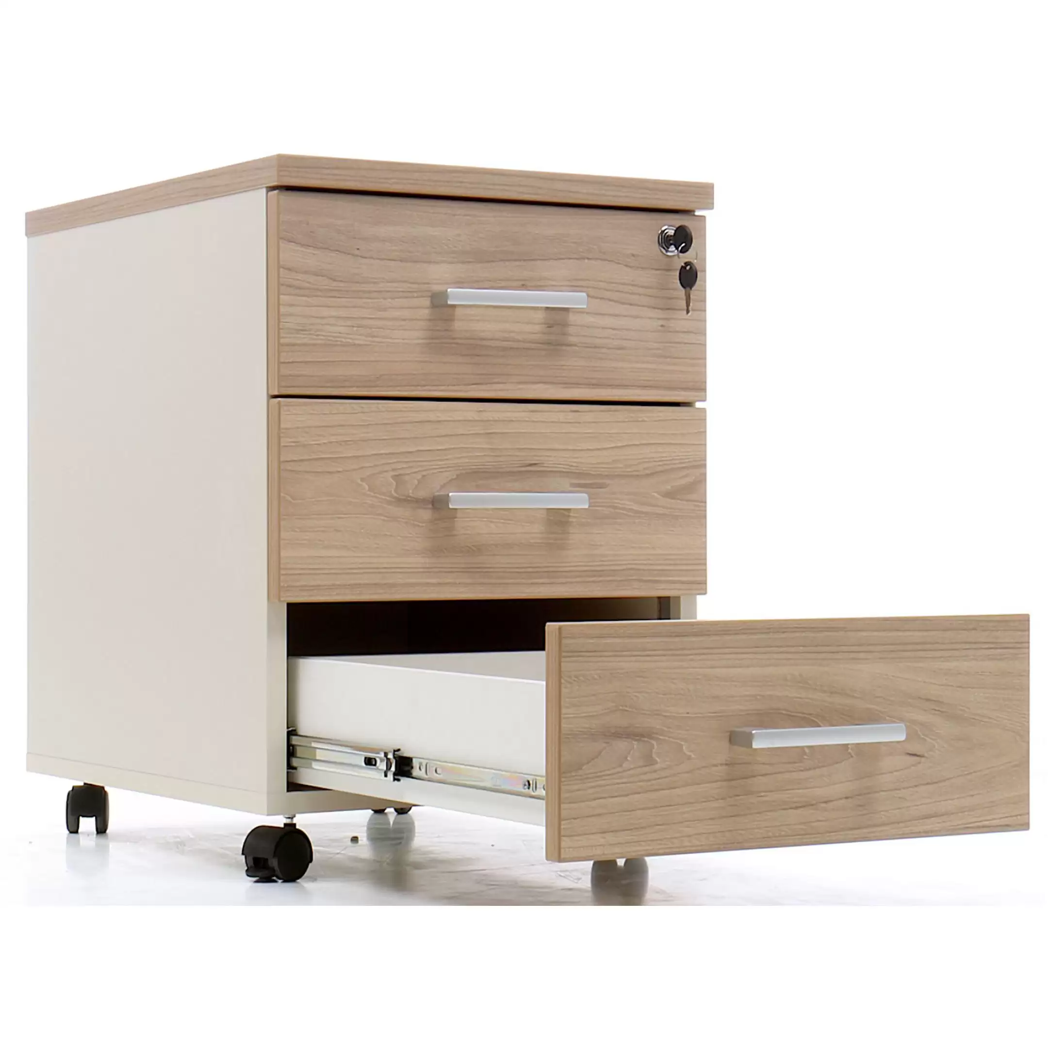 • запирается центральным замком и оснащена пластмассовым лотком для канцелярских принадлежностей в верхнем ящике;