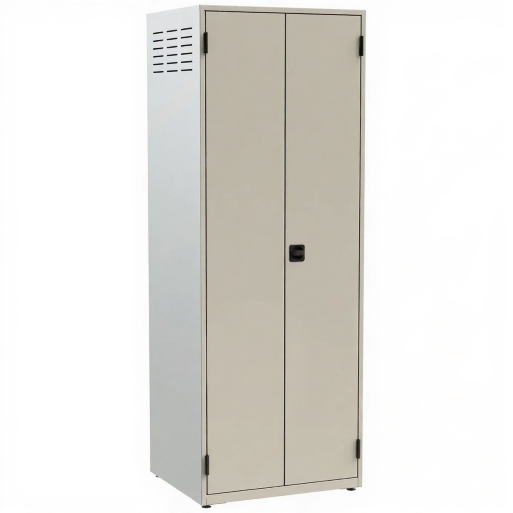 - Специализированная организация внутреннего пространства — шкаф оборудован штангой для подвешивания костюмов, полками для противогазов, касок и баллонов, а также отсеками для обуви и перчаток. Это обеспечивает порядок, быстрый поиск нужного комплекта и его целостность.