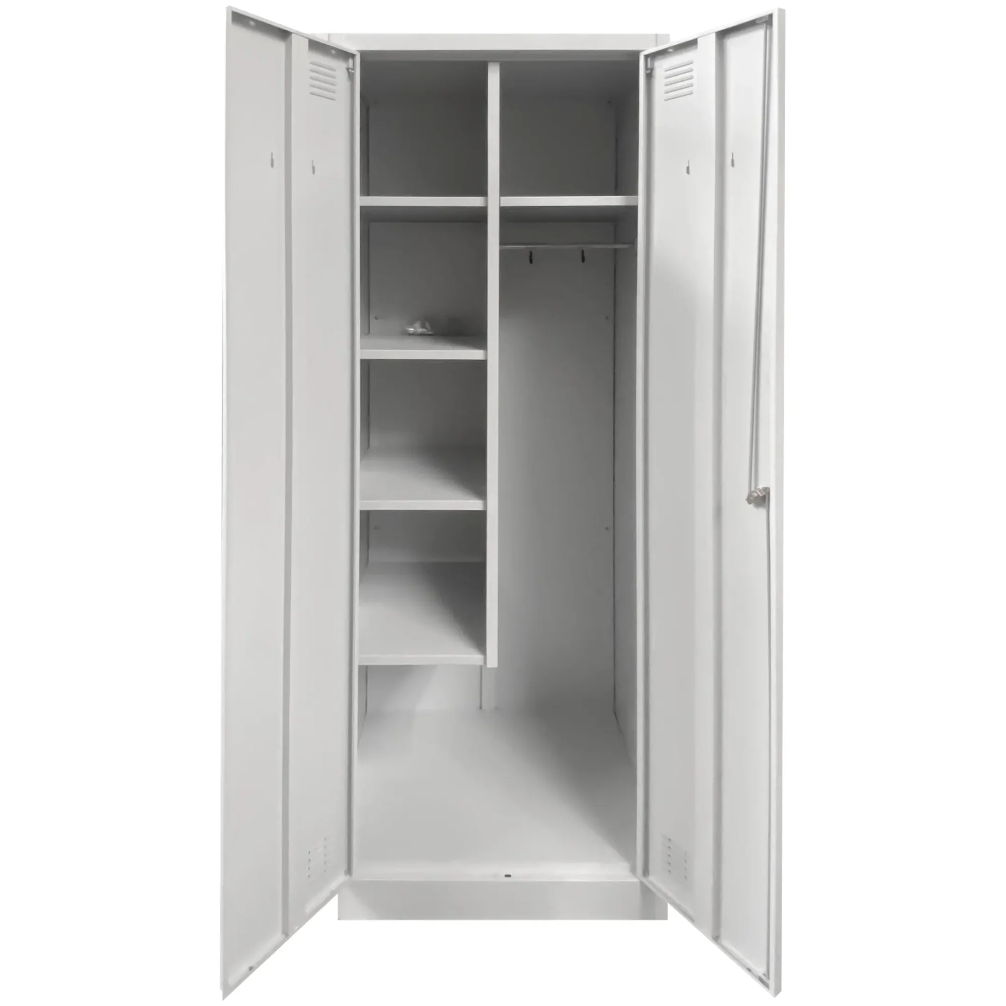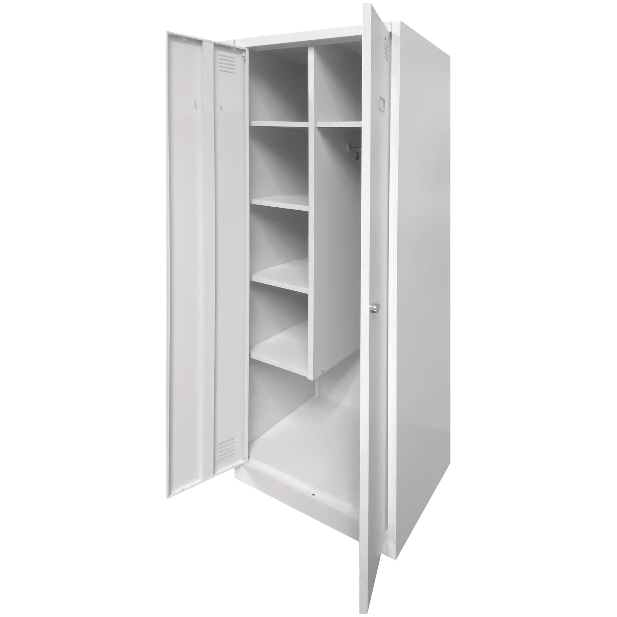 - Универсальность и адаптивность — шкаф может использоваться для хранения не только уборочного инвентаря, но и рабочей одежды, инструментов, запасных частей и других хозяйственных принадлежностей в зависимости от потребностей организации.