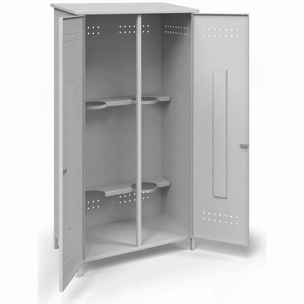 - Оптимальные габариты для стандартной компоновки — размеры шкафа (высота 2 м, ширина 1 м, глубина 56 см) специально подобраны для удобного вертикального размещения двух типовых газовых баллонов. Он занимает минимум полезного пространства в углу или вдоль стены, при этом обеспечивает легкий доступ для замены баллонов и их надежную фиксацию внутри.