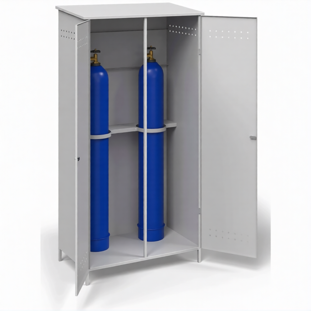 Шкаф металлический для 2-х газовых баллонов ШГБК-V1 усиленный с уголком — это функциональное, надежное и хорошо организованное решение для безопасного хранения и защиты пары газовых баллонов с возможностью крепления редуктора и организации ввода/вывода коммуникаций. Модель представляет собой усиленный стальной защитный шкаф серии «V1», где конструктивная особенность — наличие монтажного уголка — позволяет удобно и надежно закрепить газовый редуктор на внешней или внутренней стороне шкафа. Вместимость на два баллона идеально подходит для базовых сварочных или ремонтных работ. Конструкция разработана для строгого соблюдения правил пожарной и промышленной безопасности, обеспечивая комплексную защиту оборудования и удобство эксплуатации.