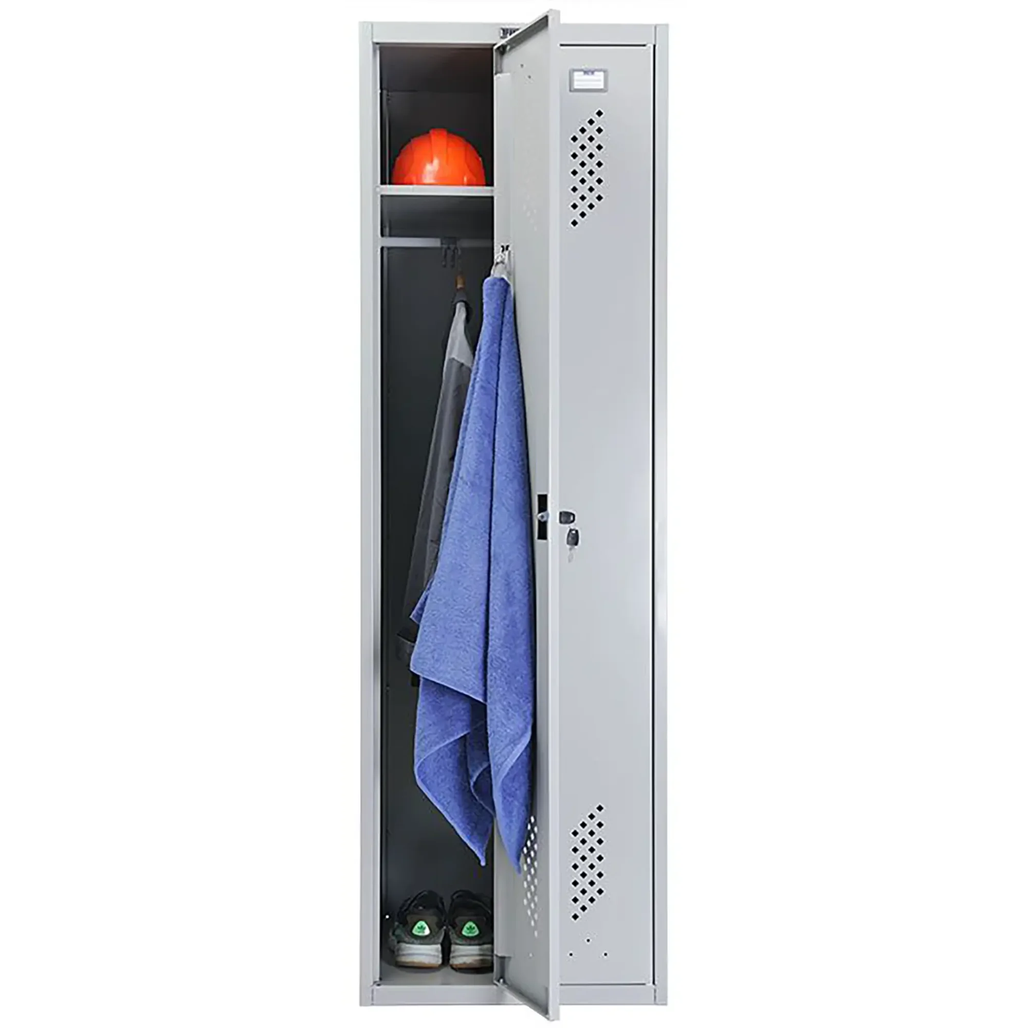 Опции: замком PL (вместо ключевого замка устанавливается бесключевой замок Euro-locks A129 с устройством под навесной замок), кодовый механический или кодовый электронный (по запросу), для камер хранения или фитнес центров; полка под обувь, подставка или скамья-подставка под шкаф, наклонная крыша.